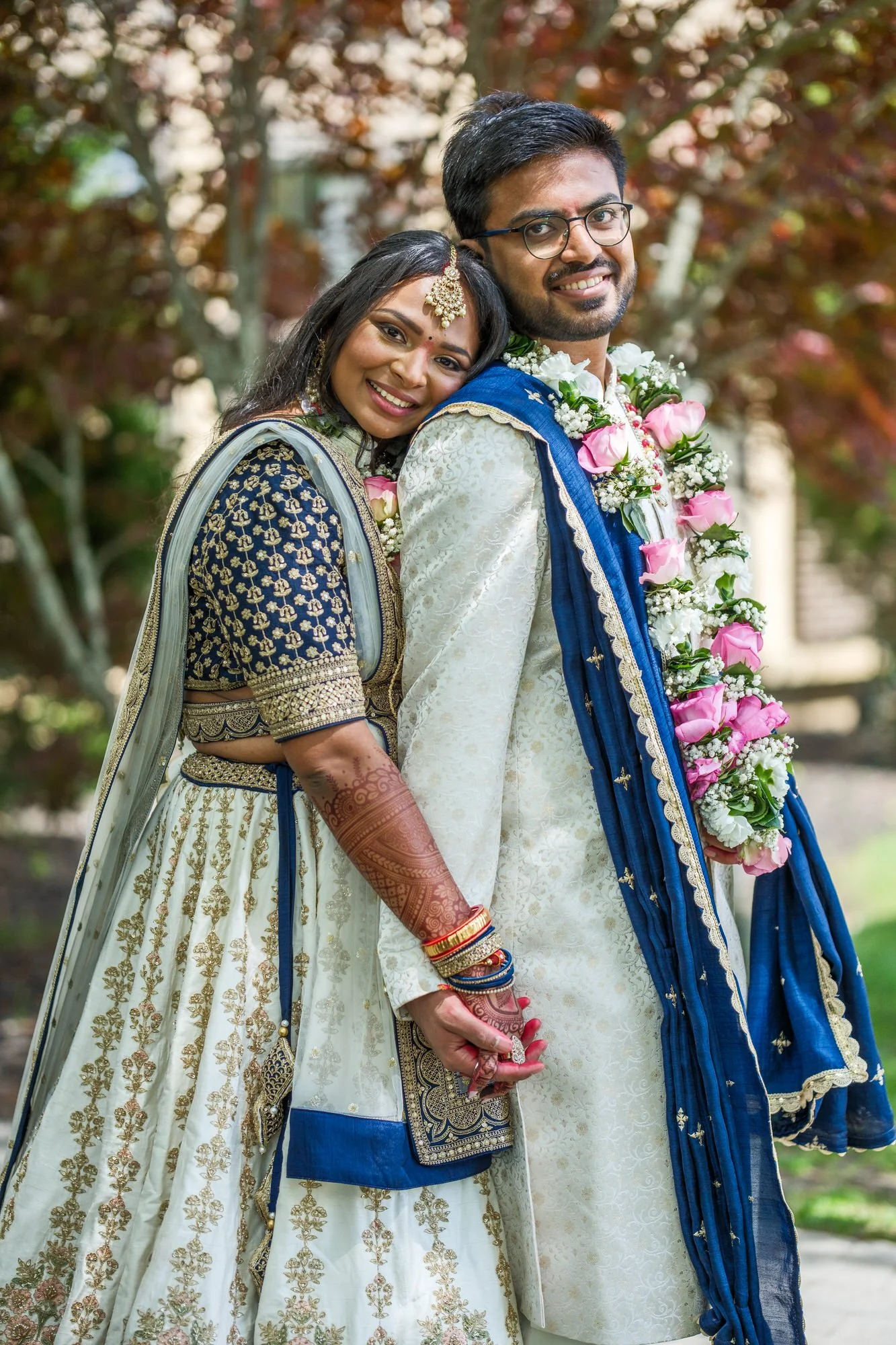 From the moment the day began, the energy was electric. The morning preparations were filled with excitement and anticipation. Riya looked breathtaking in her intricately embroidered blue and gold lehenga, adorned with traditional jewelry that shimmered with each step. Urvish was equally regal in his cream sherwani, complete with a deep maroon dupatta.